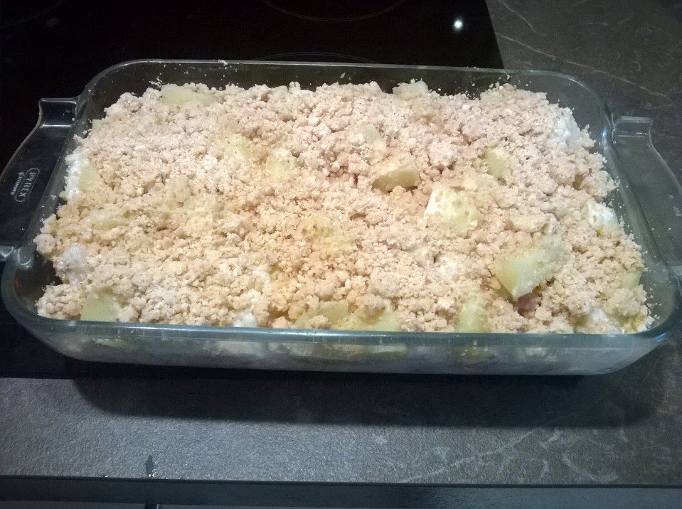 - Préparer la pate à crumble , mélanger la farine la chapelure et le beurre.déposer le crumble sur la préparation précédente.